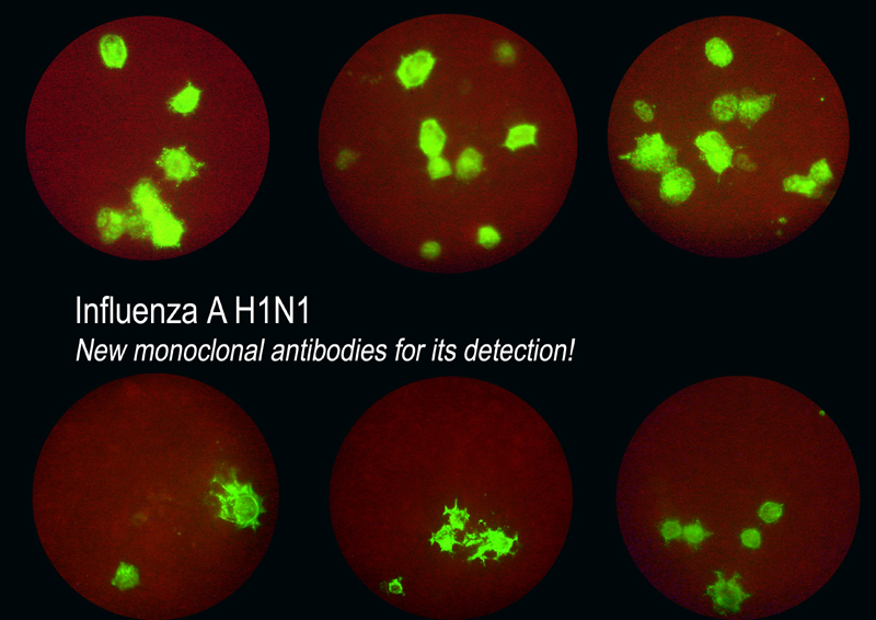 Estos nuevos productos pueden utilizarse para detectar la presencia del nuevo virus Influenza A H1N1 (así como la gripe estacional) y permiten cuantificar la carga viral con una prueba de inmunofluorescencia (ver foto adjunta). Su precio de lista es igual al de las referencias ACINF y KINF.